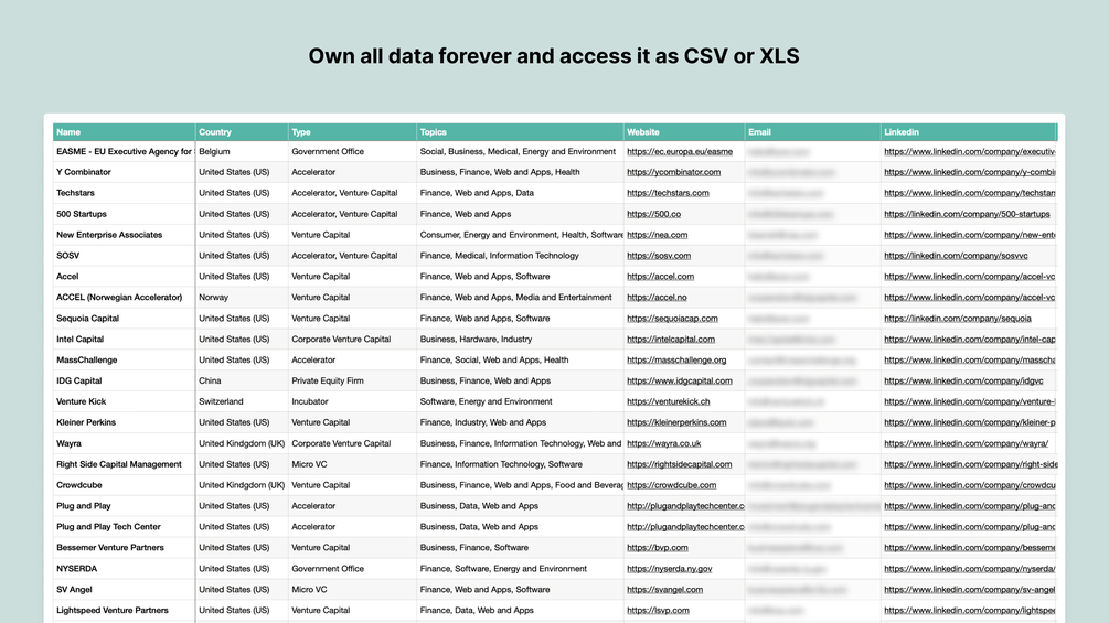 The data is made available to you as a Notion database. But you can also download it as CSV or XLSX to use it with any spreadsheet app like Excel, Numbers, Open Office Calc, Google Sheets / any mailing service like GMail, Mailchimp, HubSpot, MailJet and with any CRM system that can import CSV or Excel data.
